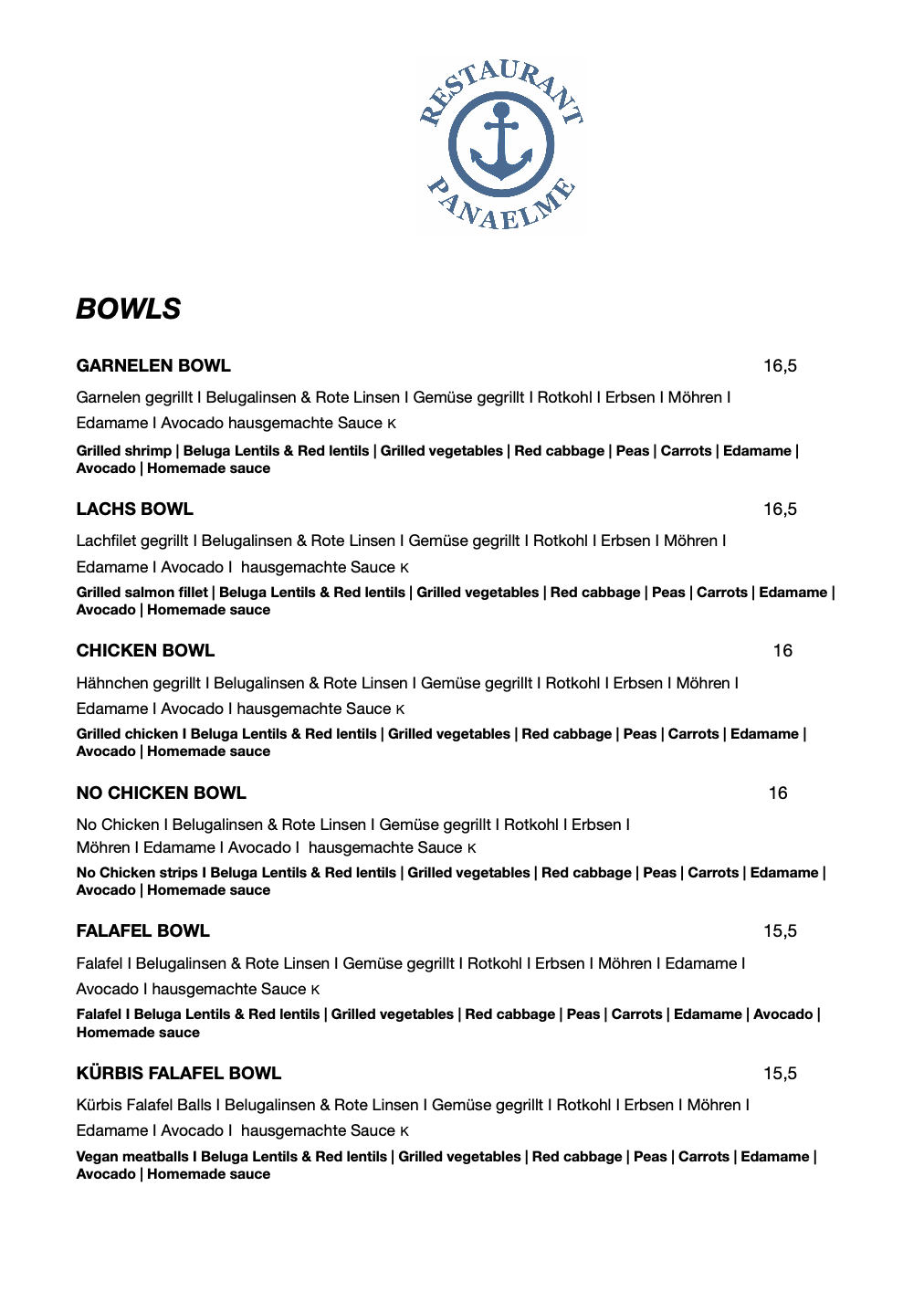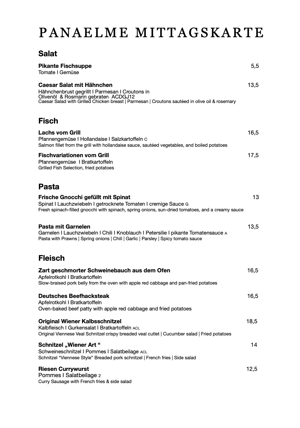 PANAELME SPEISEKARTE